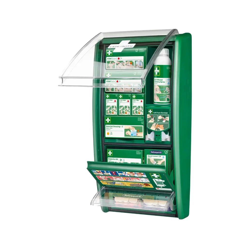 Cederroth Första Hjälpen-Tavla är designad för att ge dig trygghet och beredskap när olyckan är framme. Stationen innehåller allt som behövs för att hantera vanliga skador på arbetsplatsen – från mindre sår och skrapsår till mer allvarliga situationer som brännskador.
